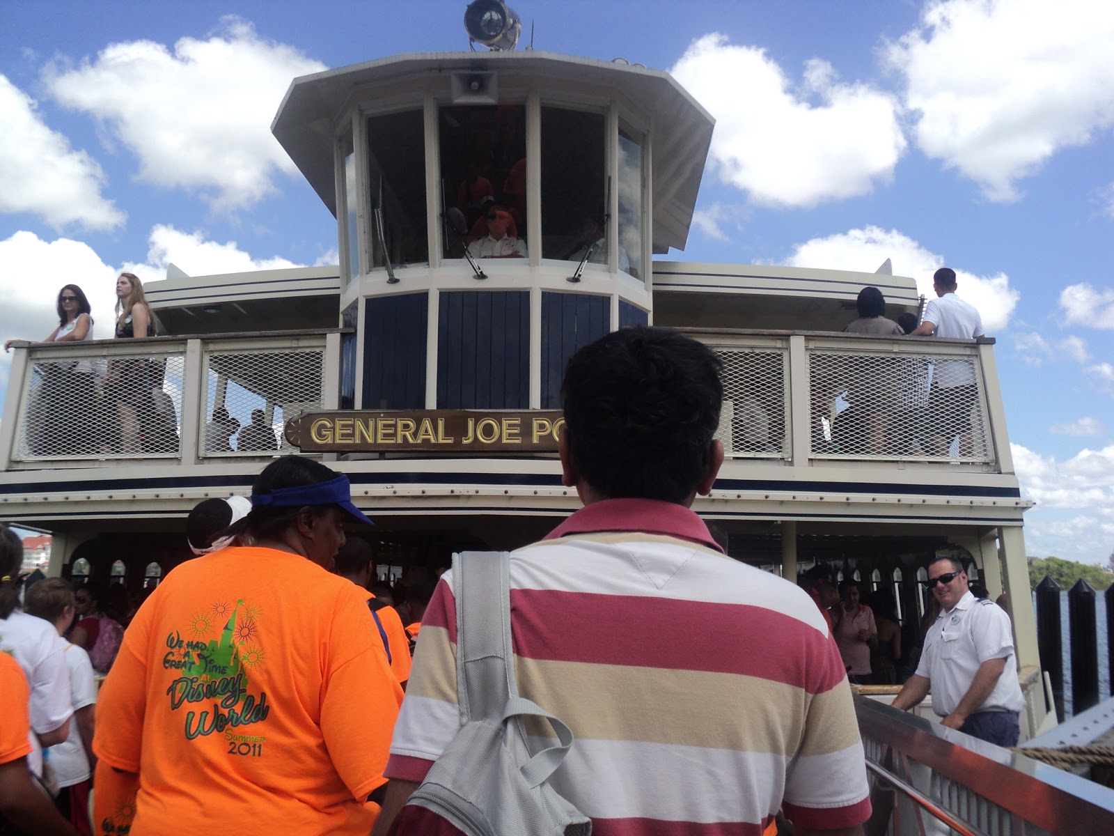 And as expected there was a long queue at the entrance. To get to Magic Kingdom we had to take the train or the ferry. We, like all the others stood in the line of the train. The train was more in demand ‘cuz it was much faster and efficient. The heat made me feel like fire. The line was moving very slowly at first. After some time it stopped moving altogether! It turned out that the train had stopped working! And instead everyone, thats right, that tremendously HUGE line, had to go by ferry. So everyone rushed towards the queues of the ferry. Thankfully we got a good spot in the queue and were able to get into the very first ferry which went there.