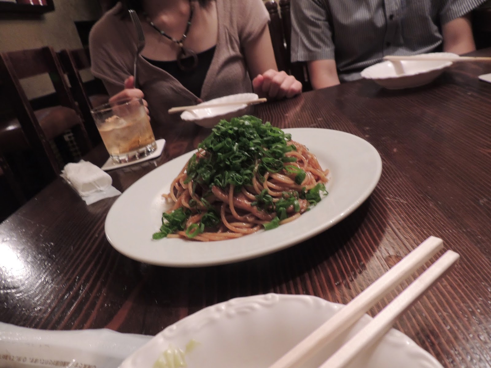 | Miso Spaghetti with duck at one of the favorite izakayas of my host family. It was AMAZING. Another interesting item on the menu that night was umeshu (in the background), an alcoholic drink of Japanese picked plum. The izakaya was so popular that we went at 5 pm. before it started to get crowded. |