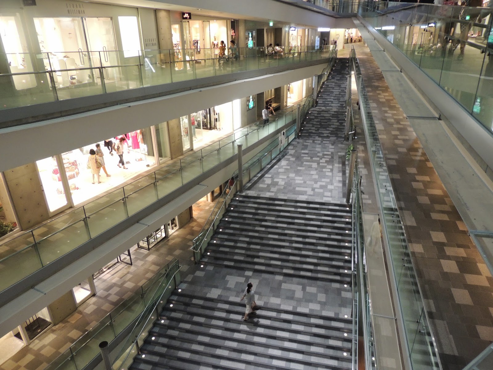 Omotesando Hills has a triangular structure to it. Notice the stairs becoming narrower near the top.