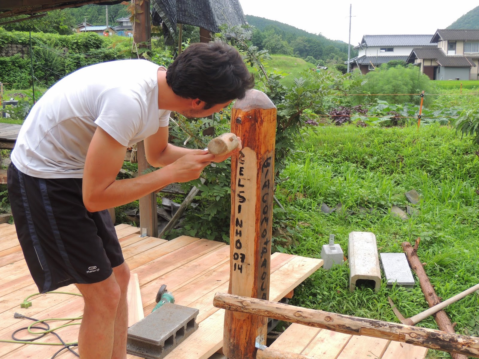 After lunch, I took a long nap and then we engraved our names on the wooden deck. All the wwofers who help create stuff carve their names on their creation. It’s great because it makes this place so international with carved names of people from different countries on the wooden decks around the house, the outhouse, etc.