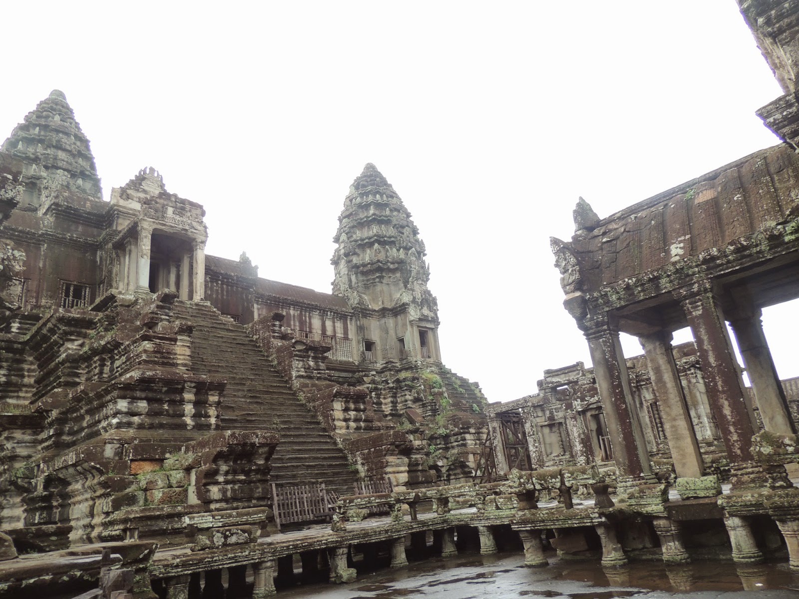 The temples at Angkor Wat went far beyond the temples I have ever known. They are more like historical ruins, with a few statues of Buddha here and there (though it was originally built for Hindu use). The colour of the walls is beautiful, mainly dark grey with tinges of green moss and the occasional red sandstone colour. There is no functional use of the temples we saw in the religious context. Its mostly a tourist spot where people walk around. Unlike other temples I’ve seen, the temples at Angkor Wat involve a lot of exploring and getting lost, much like you would in an ancient palace. The Angkor Thom is multi storey and very big in itself. After many stairs and galleried floors, you reach the core central area where there are three stone structures resembling stupas/mountains on top. This place is filled with rocks and tourists sitting on them.