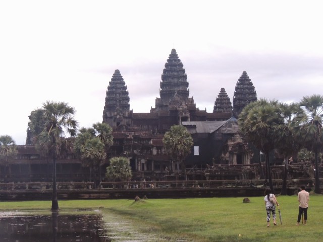 We woke up at 5 am to catch the sunrise at what is often called a wonder of the world, the Angkor Wat. Unfortunately, it was cloudy and the sun didn’t show up until around 8 am. The reason that sunrise at Angkor Wat is so hyped is that unlike most monuments, the Angkor Wat is built facing the west, so the sun rises from behind it. The reflection of the Angkor Wat falls on a lake in front of it. The Angkor Wat is not a stand alone temple and is part of the Angkor Thom, a large complex of temples. Many people spend up to 3 full days there. The sad side to that is that Angkor Thom is now private property and charges $20 per day. The complex is so large that you need to either bike or take a tuk tuk to get from one temple to another. There a small route and a larger route depending on how many temples you want to see. Florence and I took the smaller route.