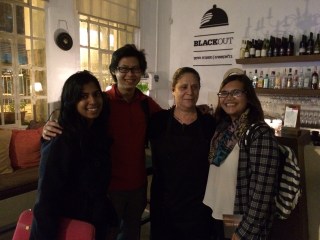 | My friends and I with our waitress Ruth after the dinner (once we were back out in the light) |