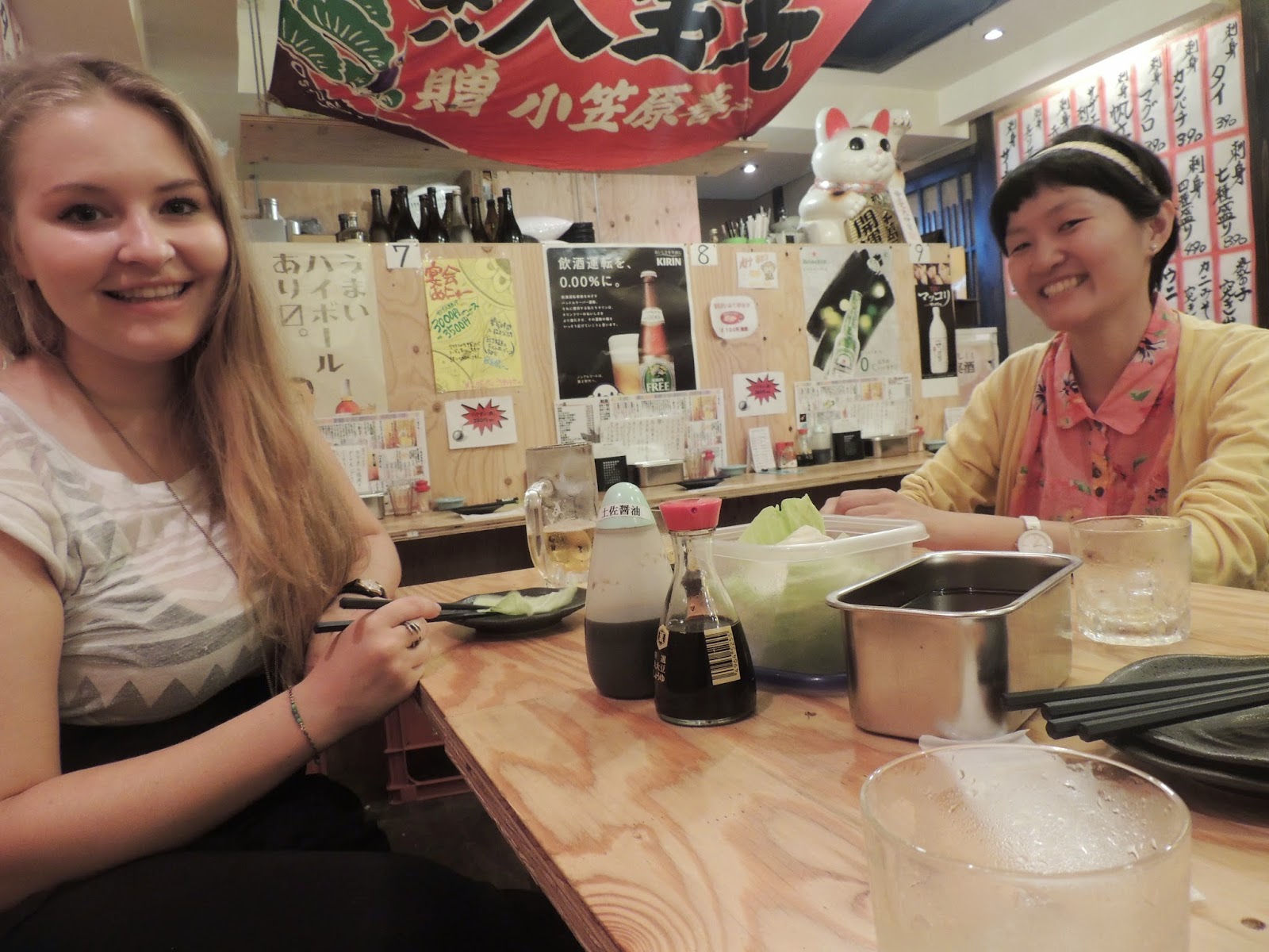 | Dinner and drinks with my new friends Sophie (left) and Lu (right) at an izakaya in Kyoto |