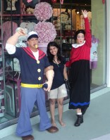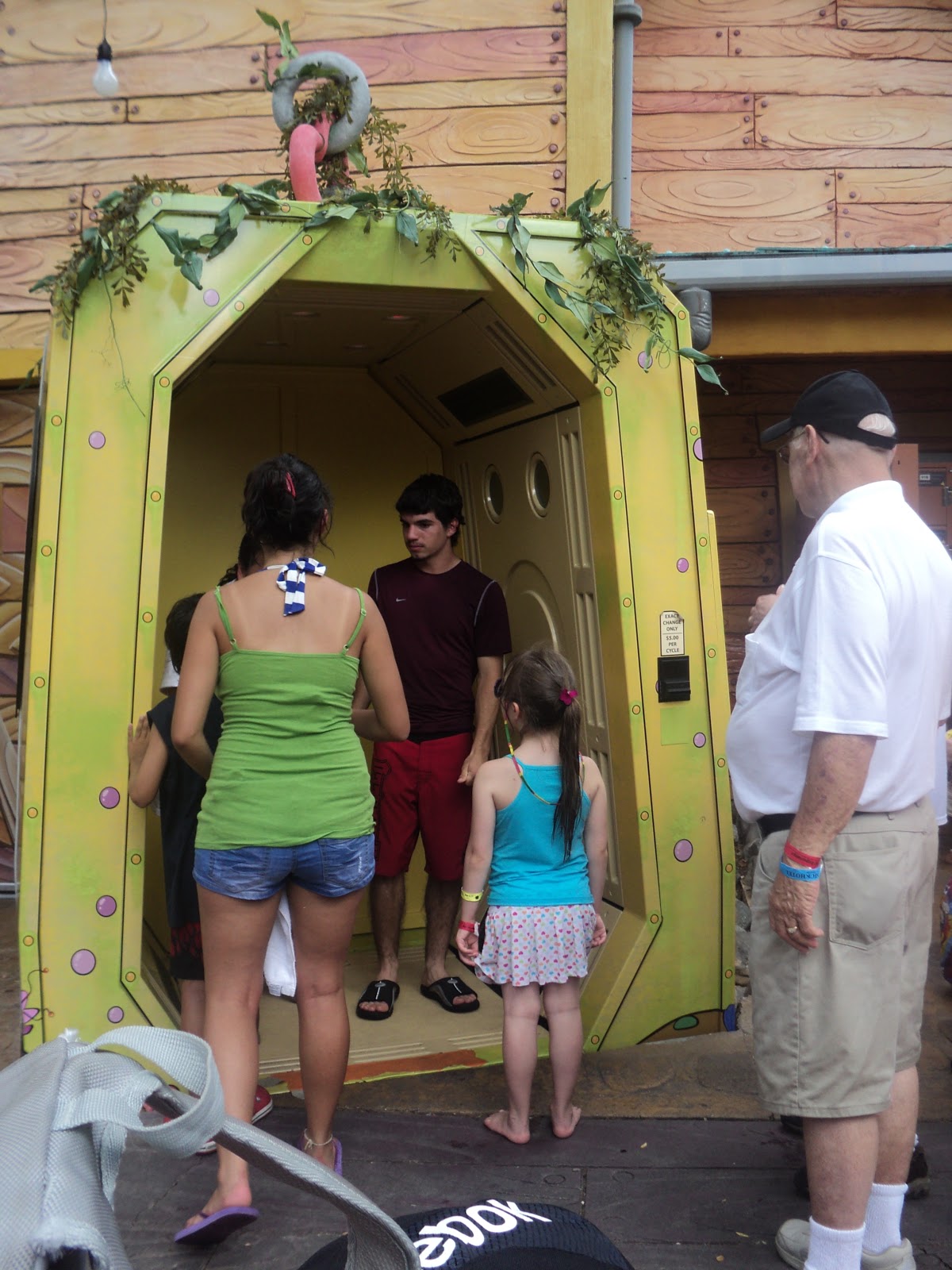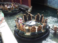 Since we’re wet anyway (and want a place to sit) we take another water ride-Popeye and Bluto’s Bilge-Rat Barges. They’re like tea cups revolving at the speed of the earth! No harm!